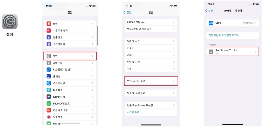2. 기기 설정 -> 일반 -> VPN 및 기기 관리 -> Soft Power Co..LTD에서 신뢰로 체크해주세요.