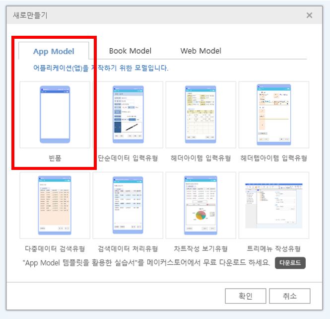앱을 만드려면? 스마트메이커 저작도구 실행 -> 상단 메뉴 [파일] -> [새로만들기] 선택 -> 팝업창이 뜨면 [App Model]을 선택하세요.