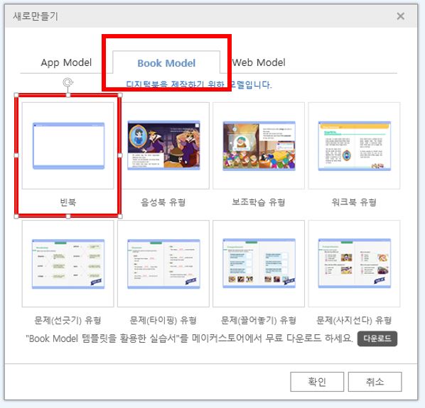 디지털북을 만드려면? 스마트메이커 저작도구 실행 -> 상단 메뉴 [파일] -> [새로만들기] 선택 -> 팝업창이 뜨면 [Book Model]을 선택하세요.
