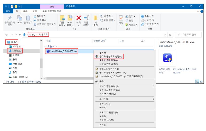 2. 내 PC -> 다운로드 경로에 설치된 [SmartMaker_버전정보.exe] 파일을 우클릭하세요.