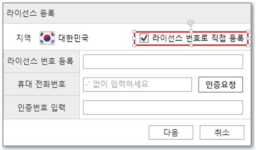 3. 라이선스 번호로 직접 등록을 체크 후, 전달받으신 CK로 시작되는 라이선스 번호를 입력하세요.