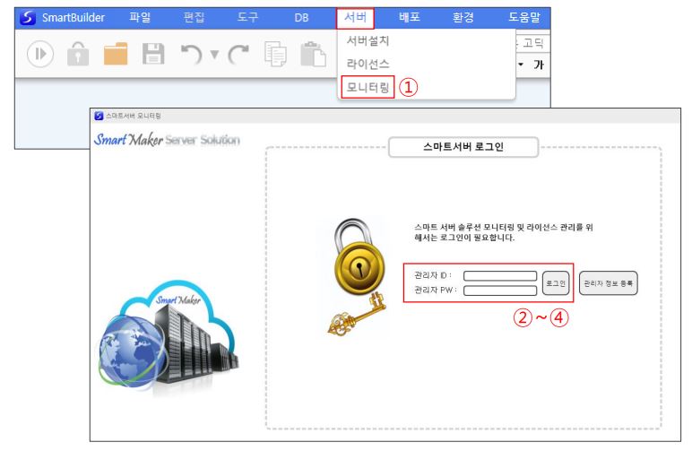 1. 스마트메이커 저작도구를 실행하고, 상단 메뉴 [서버] -> [모니터링]을 선택하세요.