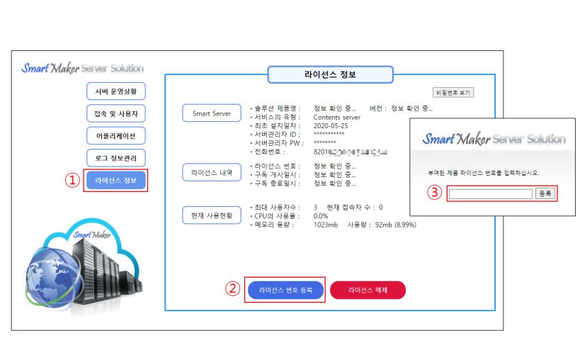 5. [로그인] 후에 나오는 스마트메이커 서버 솔루션 페이지 -> 왼쪽 메뉴 [라이선스 정보] -> 하단 [라이선스 번호 등록]에 번호를 입력하세요.